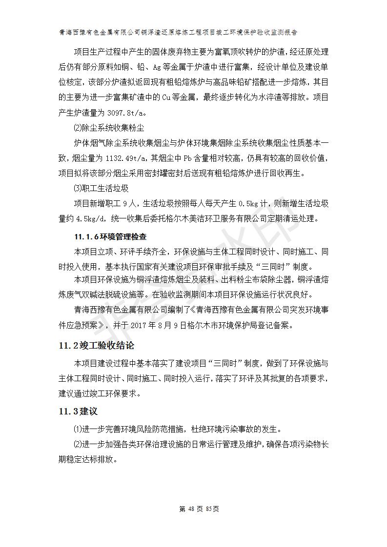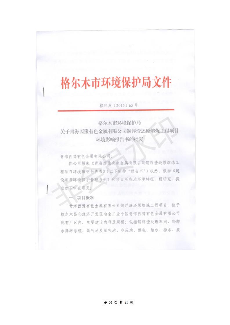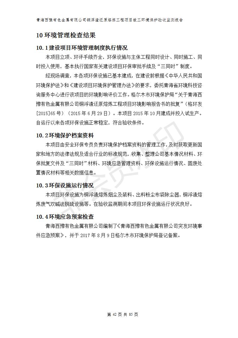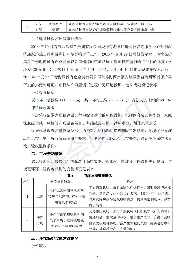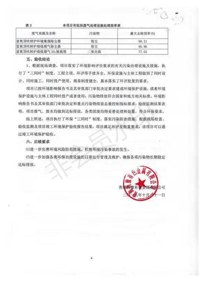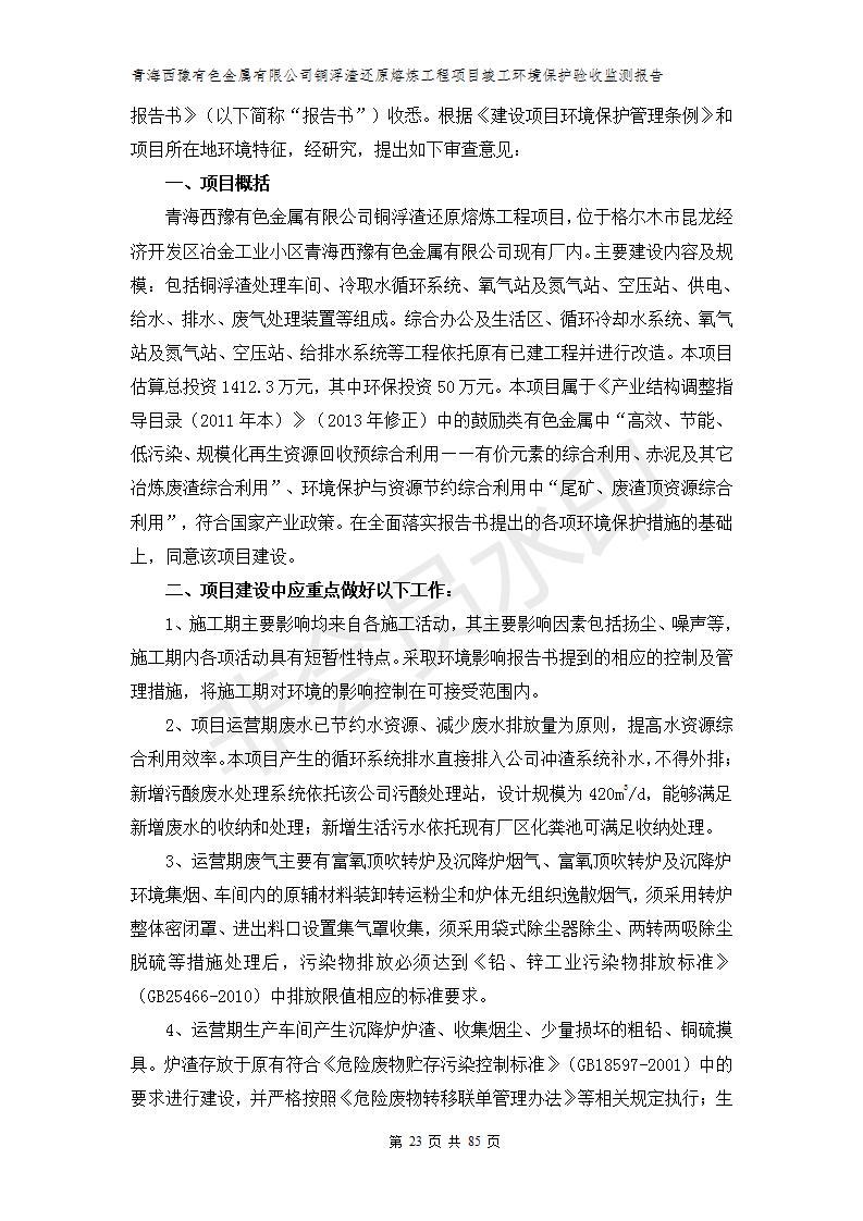 青海西豫有色金屬有限公司銅浮渣還原熔煉工程項目竣工環(huán)境保護驗收監(jiān)測報告公示發(fā)布日期:(2018-11-23) 點擊次數(shù):2787 |