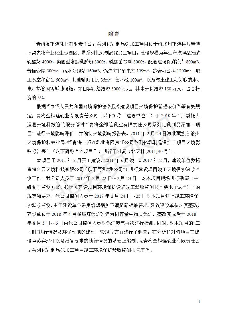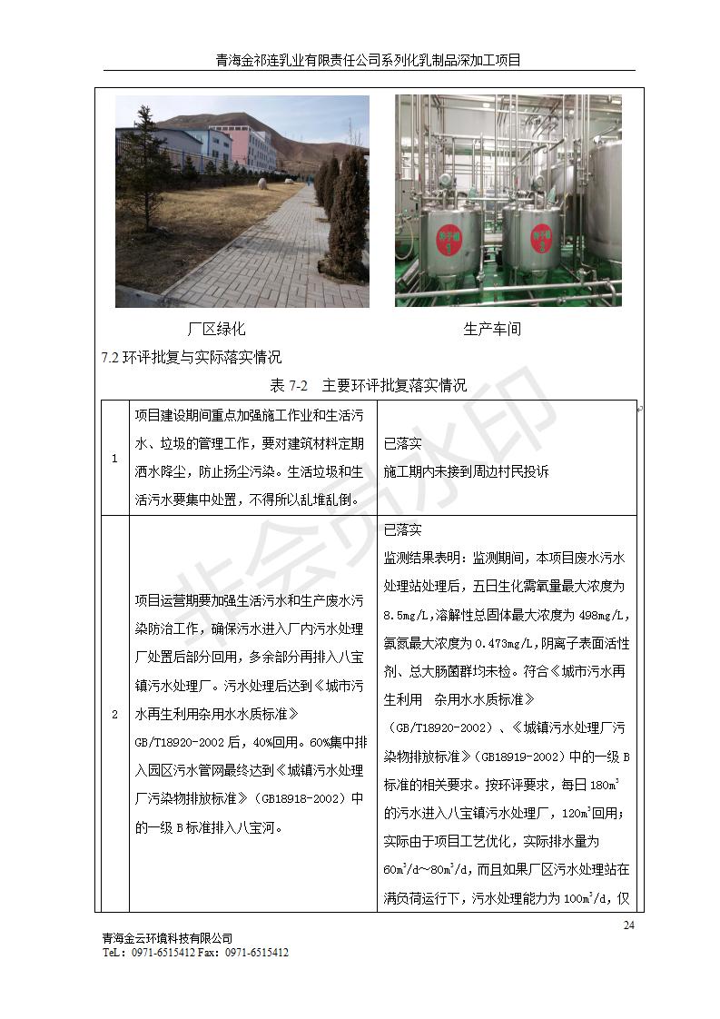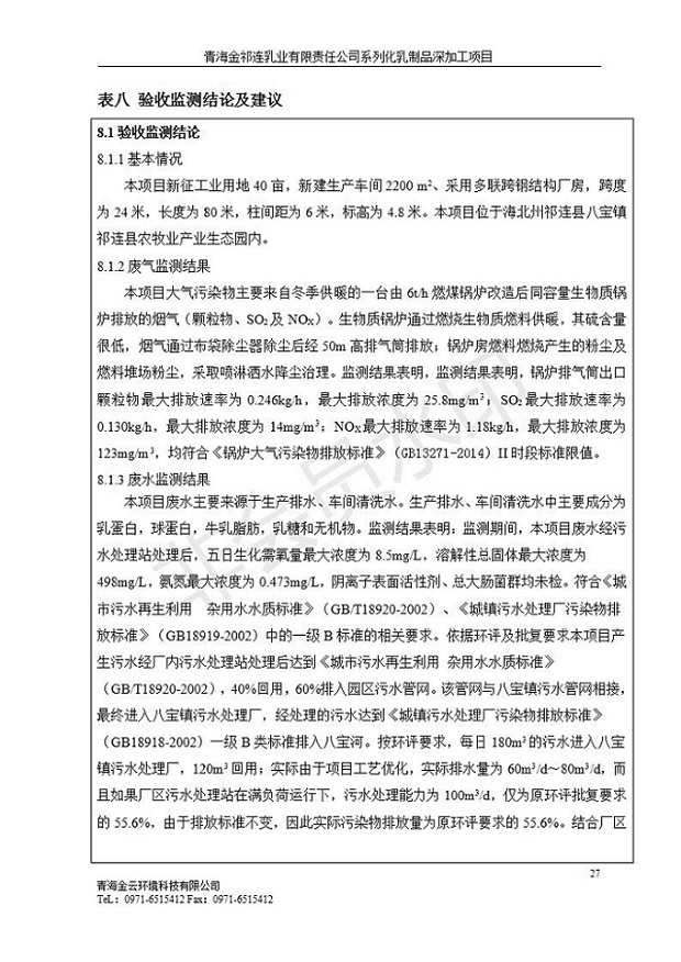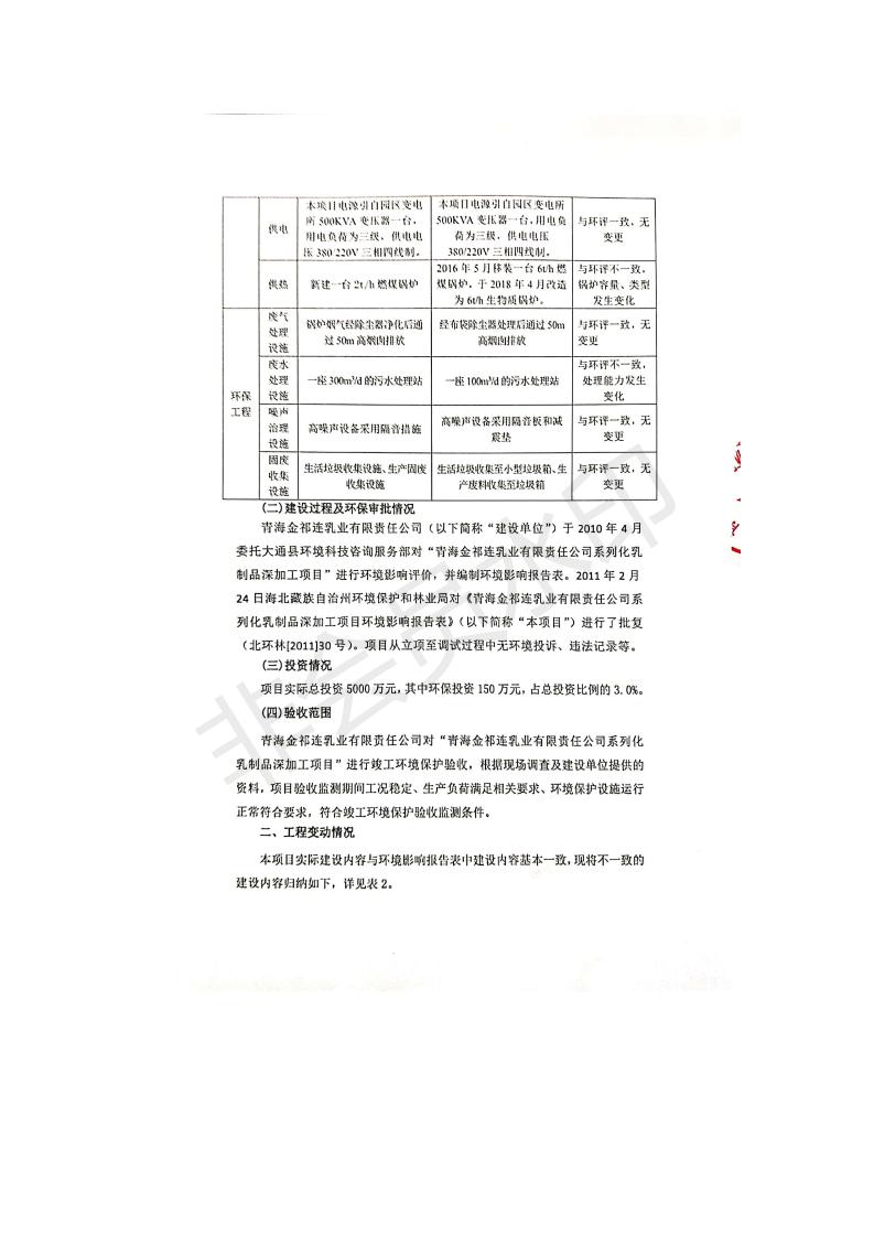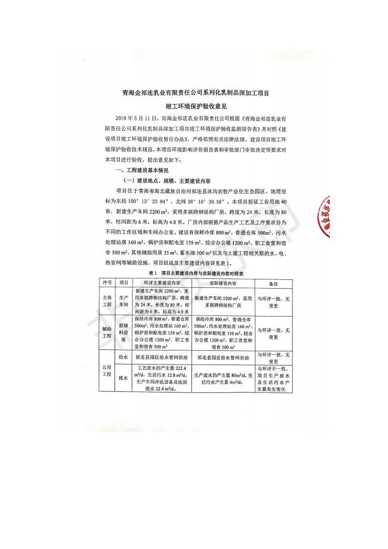 根據(jù)中華人民共和國國務(wù)院令第682號《國務(wù)院關(guān)于修改〈建設(shè)項(xiàng)目環(huán)境保護(hù)管理?xiàng)l例〉的決定》和《建設(shè)項(xiàng)目竣工環(huán)境保護(hù)驗(yàn)收暫行辦法》(國務(wù)院令682號),青海金祁連乳業(yè)有限責(zé)任公司系列化乳制品深加工項(xiàng)目(包括竣工環(huán)境保護(hù)驗(yàn)收監(jiān)測報(bào)告表和驗(yàn)收意見)公示如下。 一、項(xiàng)目名稱:青海金祁連乳業(yè)有限責(zé)任公司系列化乳制品深加工項(xiàng)目 二、地點(diǎn):海北藏族自治州祁連縣冰溝農(nóng)牧產(chǎn)業(yè)化生態(tài)園區(qū) 三、建設(shè)單位:青海金祁連乳業(yè)有限責(zé)任公司 四、建設(shè)內(nèi)容:本項(xiàng)目新征工業(yè)用地40畝,新建生產(chǎn)車間2200 m2、采用多聯(lián)跨鋼結(jié)構(gòu)廠房,跨度為24米,長度為80米,柱間距為6米,標(biāo)高為4.8米。廠房內(nèi)部根據(jù)產(chǎn)品生產(chǎn)工藝及工序要求分為不同的工作區(qū)域和車間辦公室。建設(shè)有保鮮冷庫800 m2、普通倉庫500m2、污水處理站房160 m2、鍋爐房和配電室159 m2、綜合辦公樓1200 m2、職工食堂和宿舍500 m2、其他輔助用房35 m2、蓄水池100 m2以及與土建工程相關(guān)聯(lián)的水、電、熱官網(wǎng)等輔助設(shè)施。 五、聯(lián)系人:張工 六、聯(lián)系電 話:0971-6515411 七、公示時(shí)間:二〇一九年七月十日至二〇一九年八月六日 公示期間,對上述公示內(nèi)容如有異議,請以書面形式反饋,個(gè)人須署真實(shí)姓名,單位須加蓋公章。