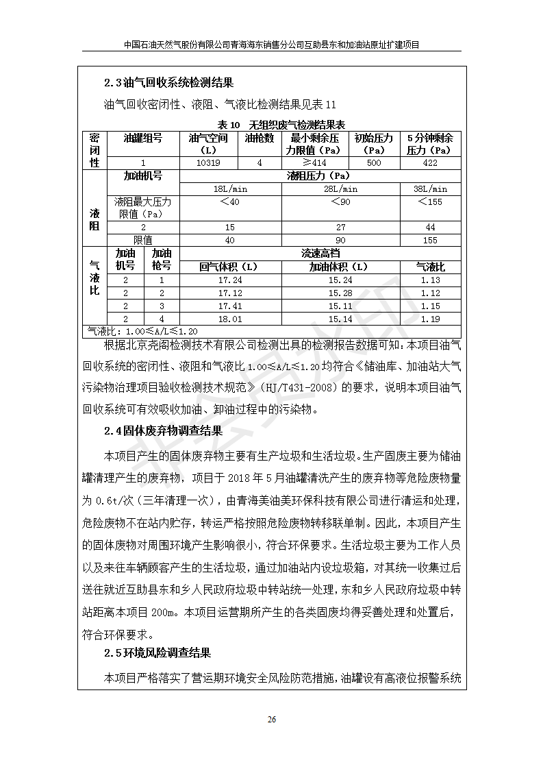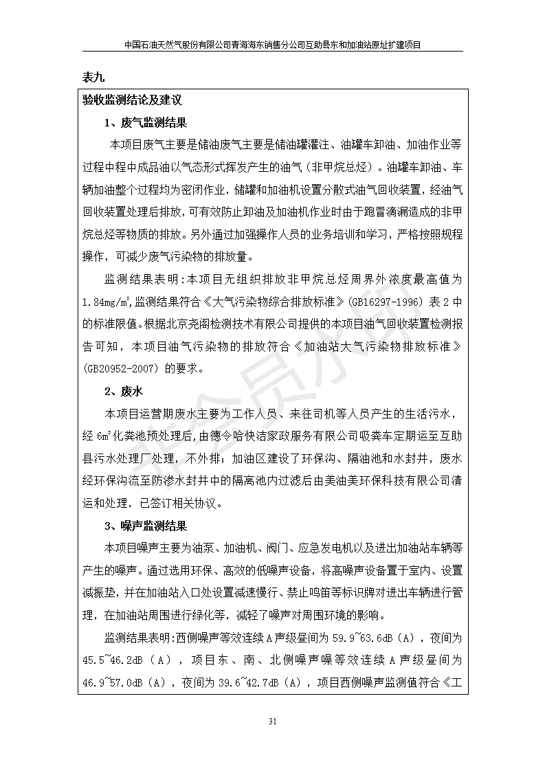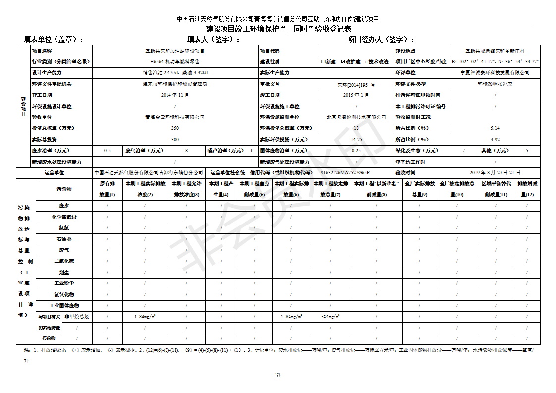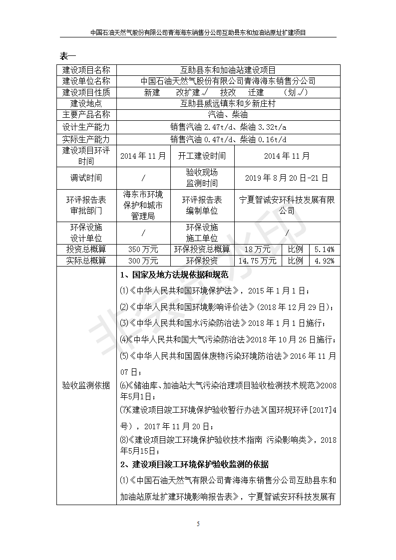 根據(jù)中華人民共和國國務(wù)院令第682號《國務(wù)院關(guān)于修改〈建設(shè)項目環(huán)境保護(hù)管理條例〉的決定》和《建設(shè)項目竣工環(huán)境保護(hù)驗收暫行辦法》(國務(wù)院令682號),互助縣東和加油站原址擴(kuò)建項目(包括竣工環(huán)境保護(hù)驗收監(jiān)測報告表和驗收意見)公示如下。 一、項目名稱:互助縣東和加油站原址擴(kuò)建項目 二、地點(diǎn):互助縣威遠(yuǎn)鎮(zhèn)東和鄉(xiāng)新莊村 六、聯(lián)系電話:0971-6515411 七、公示時間:二〇一九年九月二十七日至二〇一九年十月二十九日 公示期間,對上述公示內(nèi)容如有異議,請以書面形式反饋,個人須署真實姓名,單位須加蓋公章。