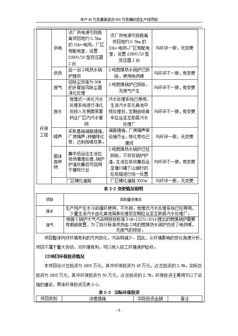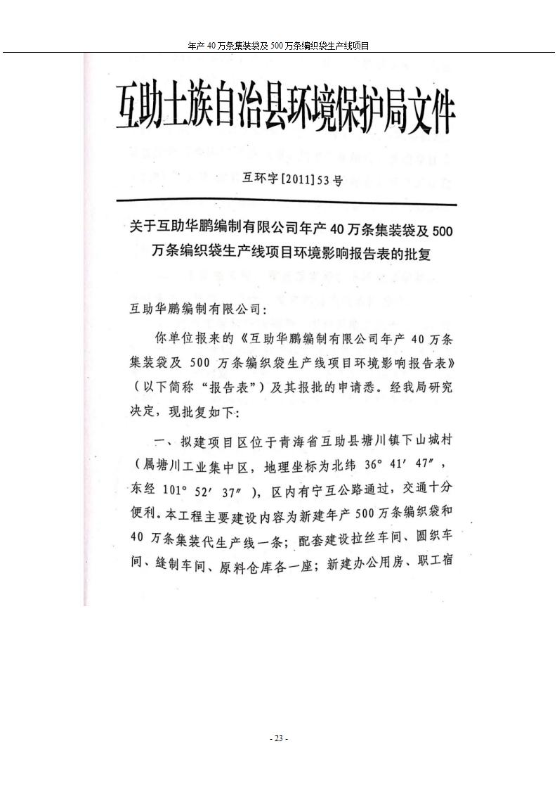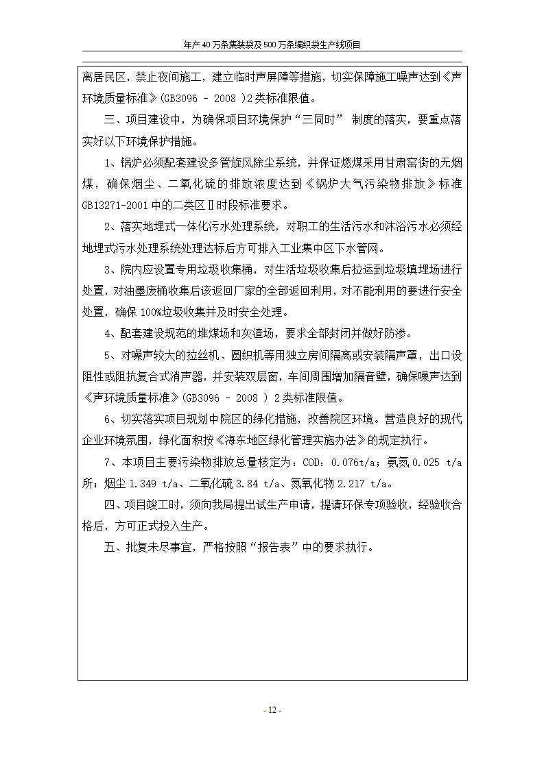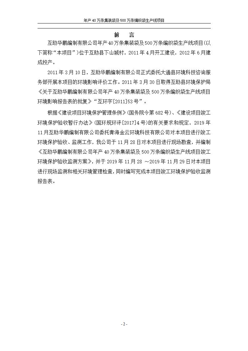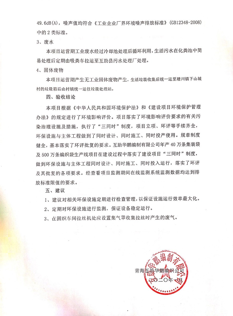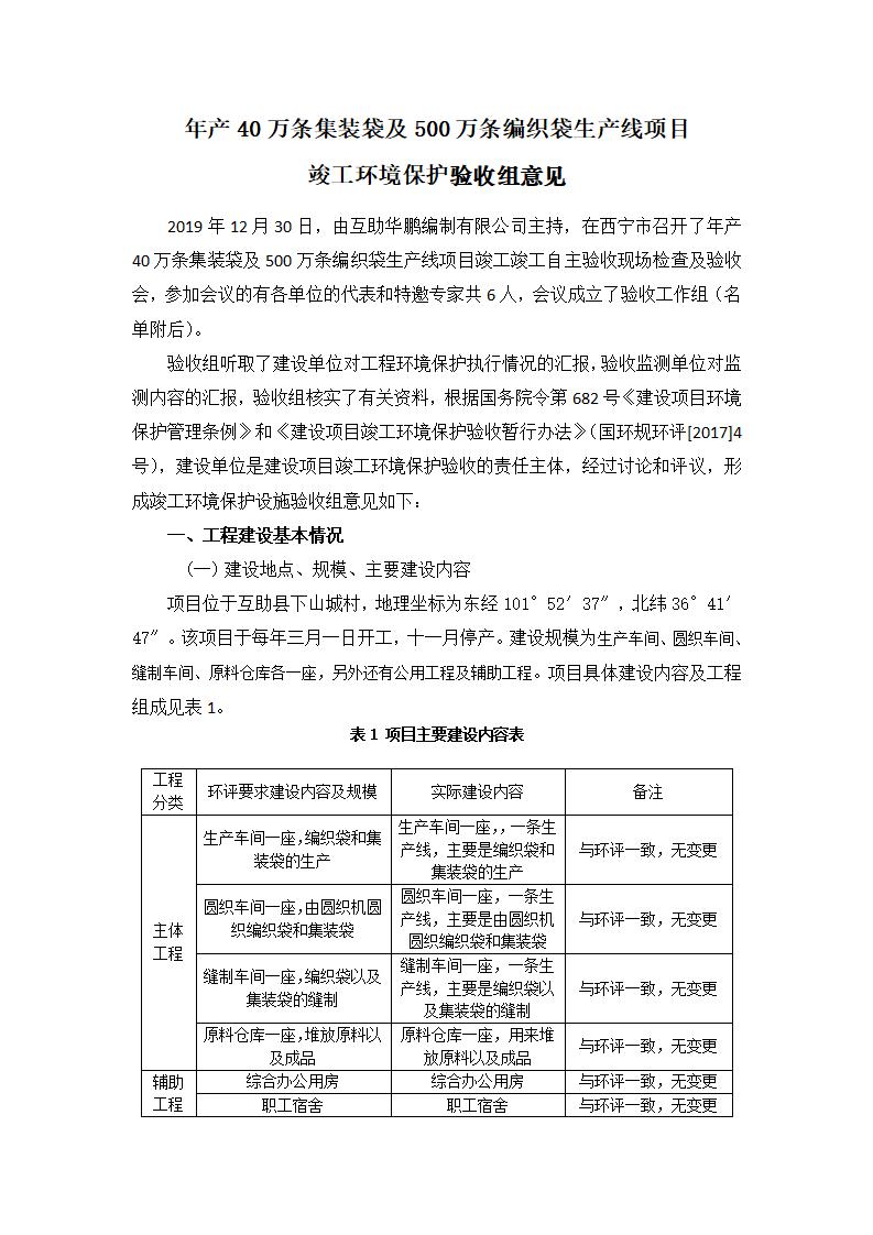根據(jù)中華人民共和國國務(wù)院令第682號《國務(wù)院關(guān)于修改〈建設(shè)項(xiàng)目環(huán)境保護(hù)管理?xiàng)l例〉的決定》和《建設(shè)項(xiàng)目竣工環(huán)境保護(hù)驗(yàn)收暫行辦法》(國務(wù)院令682號),年產(chǎn)40萬條集裝袋及500萬條編織袋生產(chǎn)線項(xiàng)目(包括竣工環(huán)境保護(hù)驗(yàn)收調(diào)查表和驗(yàn)收意見)公示如下。 一、項(xiàng)目名稱: 年產(chǎn)40萬條集裝袋及500萬條編織袋生產(chǎn)線項(xiàng)目 二、地點(diǎn):互助縣塘川鎮(zhèn)下山城村 五、聯(lián)系人:張工 六、聯(lián)系電話:0971-6515411 七、公示時間:二〇二〇年一月十三日至二〇二〇年二月十二日 公示期間,對上述公示內(nèi)容如有異議,請以書面形式反饋,個人須署真實(shí)姓名,單位須加蓋公章。