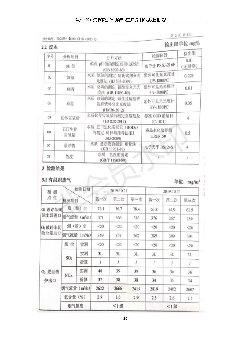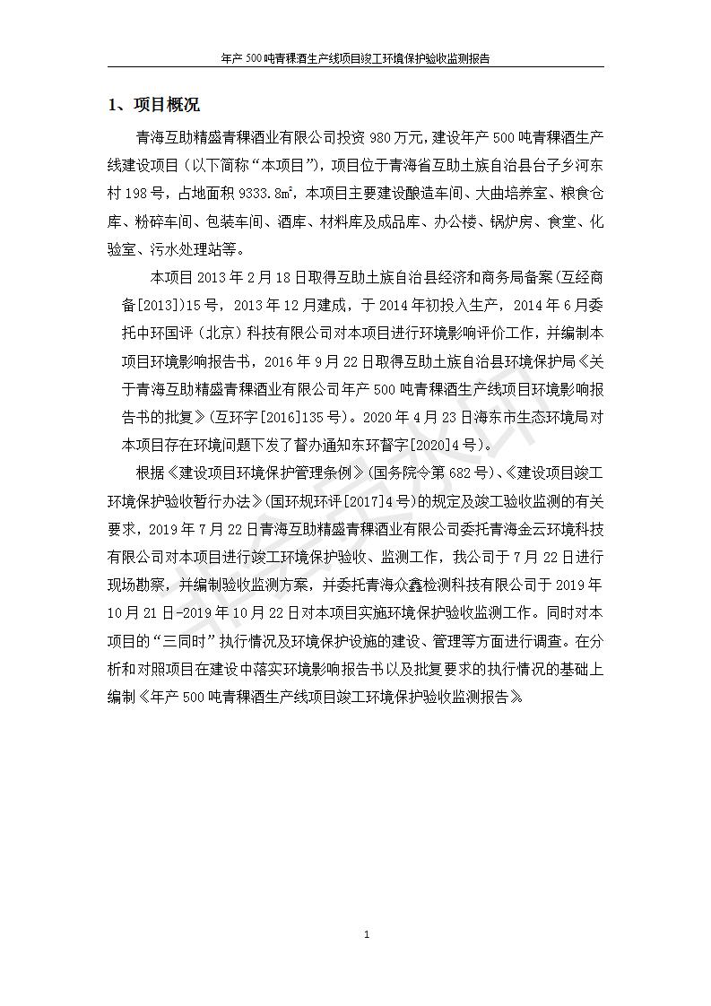 根據(jù)中華人民共和國國務(wù)院令第682號《國務(wù)院關(guān)于修改〈建設(shè)項(xiàng)目環(huán)境保護(hù)管理?xiàng)l例〉的決定》和《建設(shè)項(xiàng)目竣工環(huán)境保護(hù)驗(yàn)收暫行辦法》(國務(wù)院令682號),綜合檢測實(shí)驗(yàn)室建設(shè)項(xiàng)目(包括竣工環(huán)境保護(hù)驗(yàn)收監(jiān)測報(bào)告表和驗(yàn)收意見)公示如下。 一、項(xiàng)目名稱:青;ブ⑶囡茦I(yè)有限公司年產(chǎn)500噸青稞酒業(yè)生產(chǎn)線建設(shè)項(xiàng)目 二、地點(diǎn):青海省海東市互助土族自治縣臺子鄉(xiāng)河?xùn)|村198號