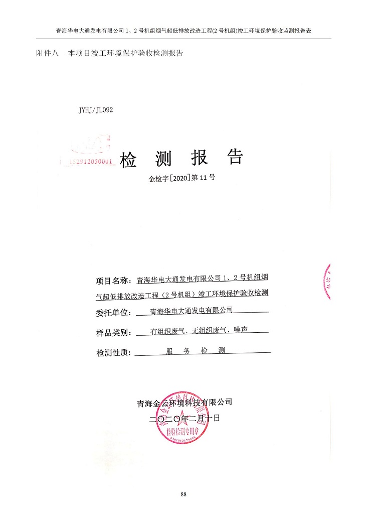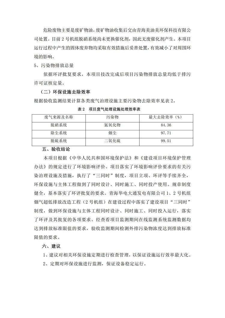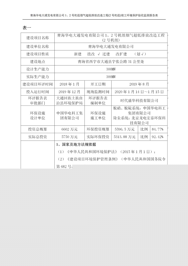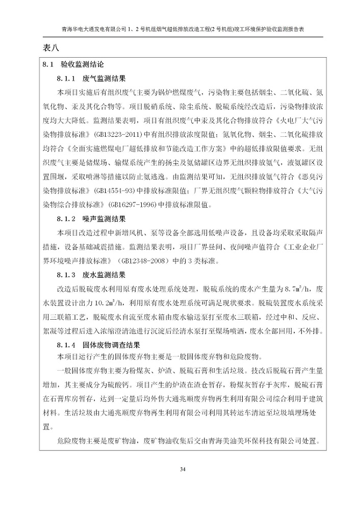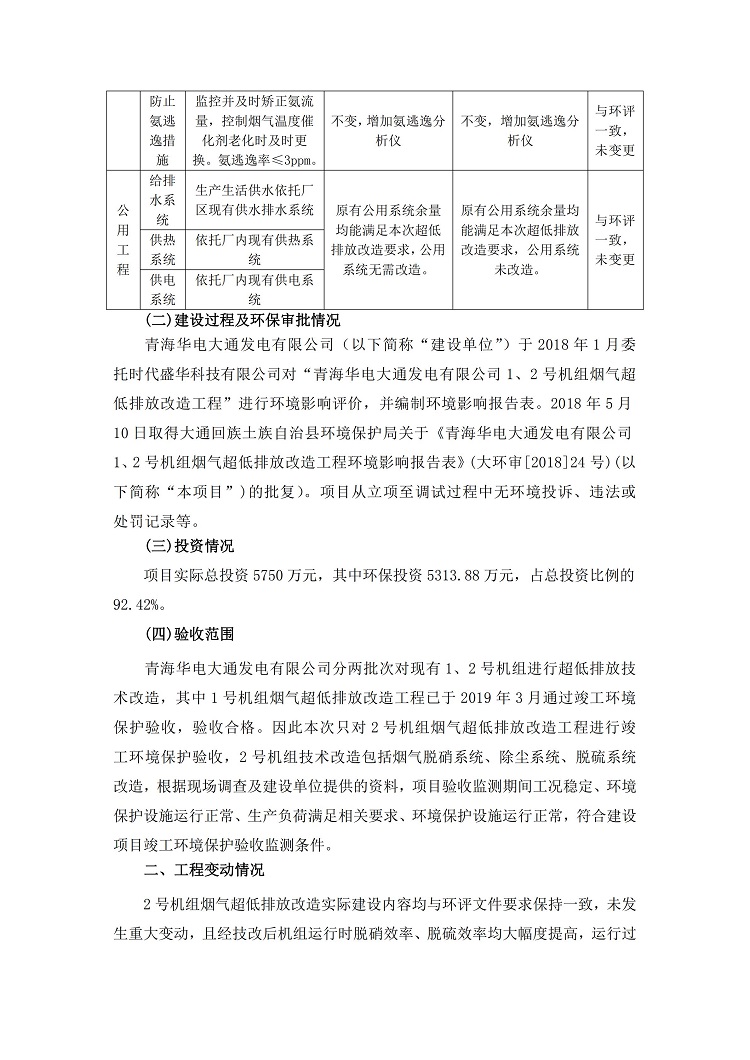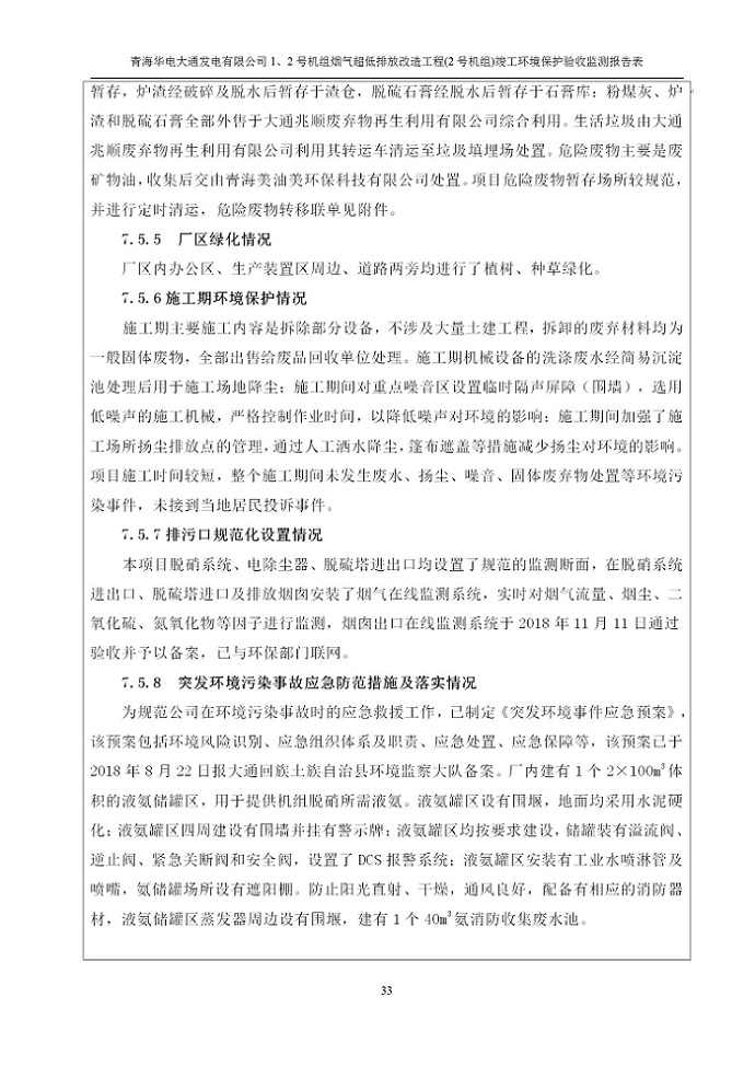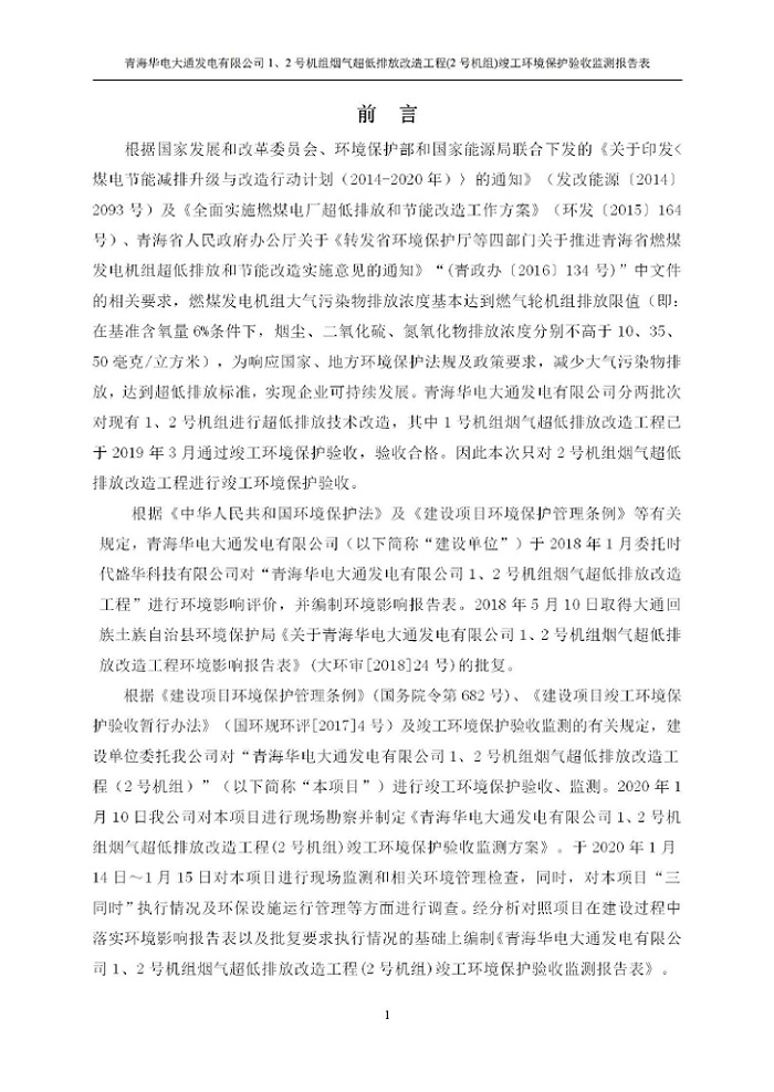 根據(jù)中華人民共和國國務(wù)院令第682號(hào)《國務(wù)院關(guān)于修改〈建設(shè)項(xiàng)目環(huán)境保護(hù)管理?xiàng)l例〉的決定》和《建設(shè)項(xiàng)目竣工環(huán)境保護(hù)驗(yàn)收暫行辦法》(國務(wù)院令682號(hào)),青海華電大通發(fā)電有限公司1、2號(hào)機(jī)組煙氣超低排放改造工程(2號(hào)機(jī)組) (包括竣工環(huán)境保護(hù)驗(yàn)收監(jiān)測(cè)報(bào)告表和驗(yàn)收意見)公示如下。 一、項(xiàng)目名稱:青海華電大通發(fā)電有限公司1、2號(hào)機(jī)組煙氣超低排放改造工程(2號(hào)機(jī)組) 竣工環(huán)境保護(hù)驗(yàn)收監(jiān)測(cè)報(bào)告表 二、地點(diǎn):青海省西寧市大通縣寧張公路31公里處 三、建設(shè)單位:青海華電大通發(fā)電有限公司 四、建設(shè)內(nèi)容:2號(hào)機(jī)組煙氣超低排放改造,2號(hào)機(jī)組改造內(nèi)容為脫硫系統(tǒng)保留原脫硫裝置作為一級(jí)塔,新建二級(jí)合金托盤塔串聯(lián)吸收塔;對(duì)原“1+2”電袋復(fù)合除塵器的一電場(chǎng)電源進(jìn)行改造,對(duì)布袋除塵器濾袋進(jìn)行更換;對(duì)原脫硝系統(tǒng)選擇性催化還原法(SCR)脫硝工藝加裝備用催化劑,每層催化劑增加聲波吹灰器,優(yōu)化SCR反應(yīng)器入口導(dǎo)流板。 五、聯(lián)系人:馬世敏 六、聯(lián)系電 話:0971-6515411 七、公示時(shí)間:二〇二〇年四月二十九日至二〇二〇年五月二十八日 公示期間,對(duì)上述公示內(nèi)容如有異議,請(qǐng)以書面形式反饋,個(gè)人須署真實(shí)姓名,單位須加蓋公章。